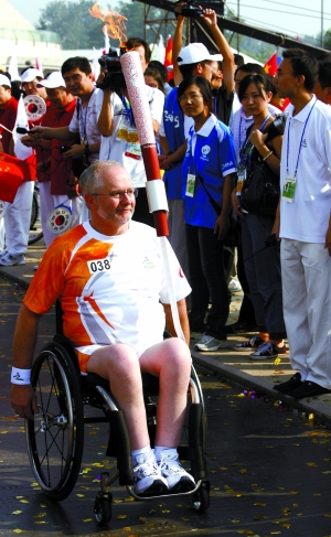 昨天上午,国际残奥委会主席克雷文在世纪坛完成了第38棒传递。不需帮扶,他用自己强健的双臂摇动轮椅“跑”完全程,印证了他对“残疾人需要独立”的理念。传递时间虽短,但中午记者在其下榻饭店采访时,他仍余兴未尽,他兴致勃勃地谈起了他对北京、对残疾人运动的看法。
