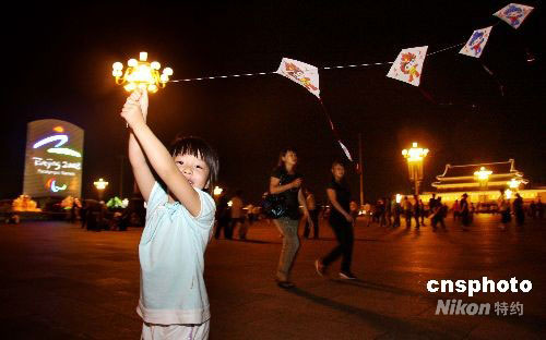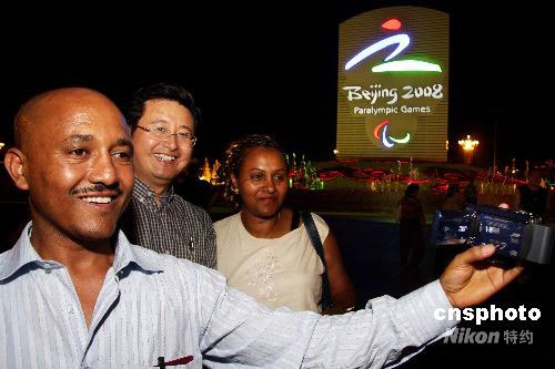 9月5日晚,北京天安门广场中心花坛的残奥会会徽“天地人”吸引了众多中外游人。随着残奥会的到来,北京到处洋溢着欢快祥和的氛围,世界各地的人们纷纷来此观光旅游。中新社发 张爱东 摄
