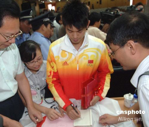 图为奥运会羽毛球男单冠军林丹为家乡球迷签名。 中新社发 刘可耕 摄