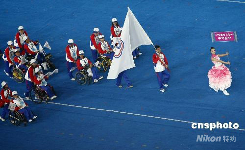 9月6日20时,北京2008年残奥会开幕式在国家体育场“鸟巢”举行,图为中华台北代表团入场。 中新社发 盛佳鹏 摄