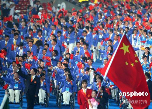 9月6日晚,北京2008残奥会开幕式在北京国家体育场——“鸟巢”举行,图为由547人组成的庞大东道主代表团--中国残奥代表团入场,旗手是刷新3项世界纪录的20岁的中国残疾人游泳运动员王晓福。 中新社发 宋吉河 摄