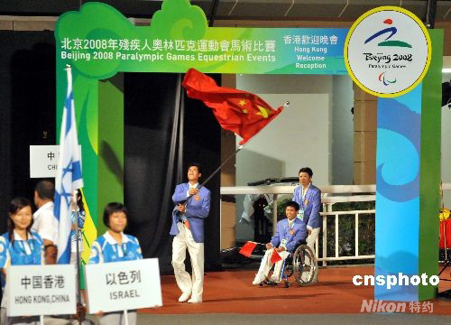 九月六日,北京二零零八年残奥会马术比赛开幕式在香港举行欢迎晚会,中国残奥马术选手彭裕连在运动员入场式上进场。中新社发 邓庆乐 摄