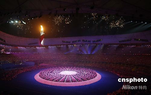 9月6日20时,北京2008年残奥会开幕式在国家体育场“鸟巢”举行,中国国家主席胡锦涛,国际残奥委会主席克雷文先生等出席开幕式。图为开幕式上的文艺表演。位于体育场中央的巨大舞台是开幕式的主表演台,整体造型象征人类的家园——地球,其直径约72米,可升高隆起5米,由360片组成、共有1440个书页的板块具备升降、翻转功能,瞬间可以变幻图案和色彩。 中新社发 盛佳鹏 摄