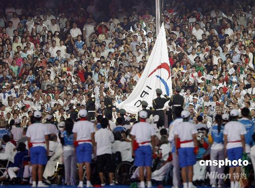 9月6日晚,北京2008残奥会开幕式在国家体育场“鸟巢”举行,残奥会旗在“鸟巢”升起。 中新社发 杜洋 摄