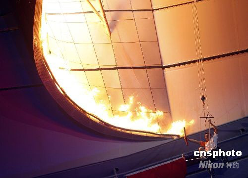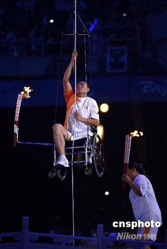 9月6日晚,北京2008残奥会开幕式在国家体育场“鸟巢”举行。 图为残奥会田径金牌获得者、最后一棒火炬手侯斌坐在轮椅上,拉绳子攀升至主火炬台下,以独特方式点燃“鸟巢”上方的主火炬。 中新社发 杜洋 摄