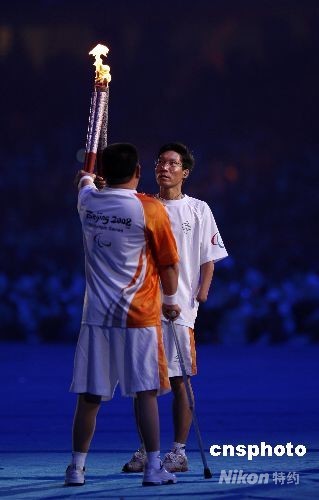 9月6日晚,北京2008残奥会开幕式在国家体育场“鸟巢”举行。运动员进行火炬传递。