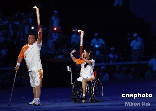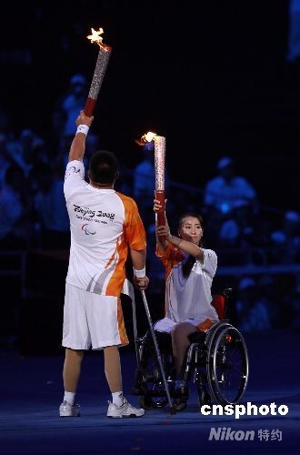 图为开幕式上,中国轮椅击剑运动员、英勇保卫北京奥运火炬的金晶(右),与残奥会游泳金牌获得者武云虎进行火炬交接。中新社发 杜洋 摄