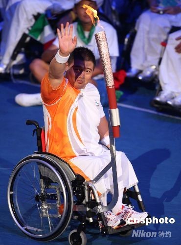 残疾运动员侯斌点燃残奥会圣火主火炬台