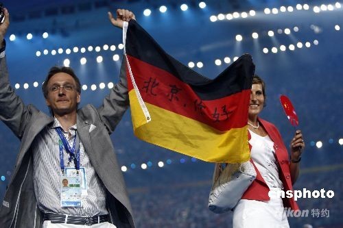 图:德国选手展示国旗上中文“北京,你好”