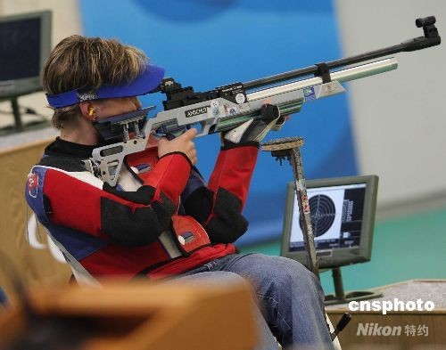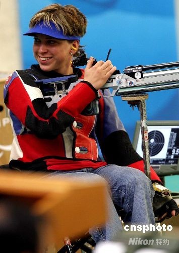 9月7日上午,北京2008残奥会拉开战幕,在北京射击馆举行的残奥会射击R2级女子10米气步枪立射-SH1项目的决赛中,斯洛伐克选手韦罗妮卡·瓦多维乔娃以494.8环领先第二名4.6环的成绩摘得头筹,摘得北京残奥会上的第一枚金牌。中新社发 宋吉河 摄