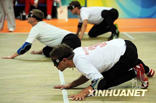 9月7日,丹麦盲人门球队队员尼尔森、彼泽森和韦克尔(从下至上)在比赛中的特别防守动作。当日,2008年北京残奥会盲人门球比赛在北京理工大学体育馆拉开战幕,雅典残奥会冠军丹麦队在首场比赛中以2比2被西班牙队逼平。新华社记者蔺以光摄