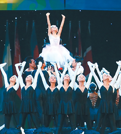 来自中国残疾人艺术团的演员们环绕在李月身边,用她们的双手去代替李月跳动的足尖。这是她永不停止的芭蕾舞步。众人手臂一波一波舞动,展现着芭蕾舞的优美雅致。被“芭蕾王子”吕萌高高托举起的这位四川女孩,在空中不停地旋转,飘逸的舞衣,阳光而自信的神情。