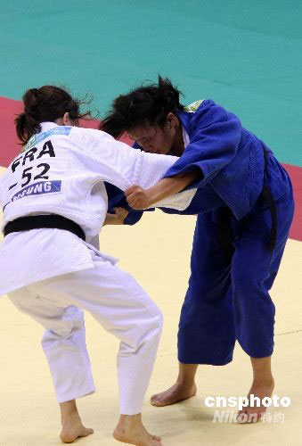 9月7日,在北京残奥会盲人柔道女子52公斤级的决赛中,中国选手崔娜(蓝衣)击败法国选手桑德里娜·奥里埃·马蒂内,获得金牌。中新社发 王韶骅 摄