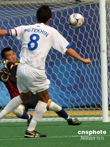 北京残奥会七人制(男子)足球比赛9月8日在北京奥林匹克公园内的橄榄球场开赛,在首场比赛中,中国队因为与对手俄罗斯队实力过于悬殊最终以0比6失败。图为俄罗斯队队长、8号伊万·波捷欣射门得分。残奥会七人制(男子)足球比赛在橄榄球赛场举行,全场共60分钟,队员为脑瘫患者。中新社发 任晨鸣 摄