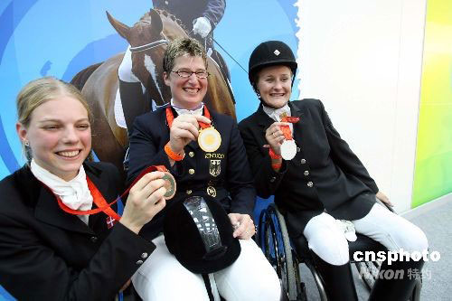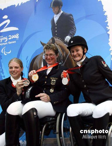 九月八日上午,德国选手布丽塔·纳佩尔(中)在香港夺得北京残奥会马术比赛个人锦标赛科目级别Ⅱ冠军,摘取残奥会马术比赛首金,加拿大选手劳伦·巴威克(右)获得银牌,丹麦选手卡罗琳·尼尔森获铜牌。中新社发 洪少葵 摄