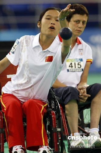 9月8日,北京残奥会硬地滚球混合单打-BC4级小组循环赛中,中国选手戚翠芳以8比3的比分战胜巴西选手桑托斯,顺利晋级四分之一决赛。 中新社发 杜洋 摄