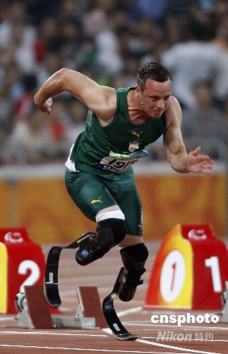 9月8日,北京残奥会男子100米-T44预赛中,南非选手“刀锋战士”皮斯特瑞斯以11秒16的成绩打破残奥会纪录。 中新社发 杜洋 摄