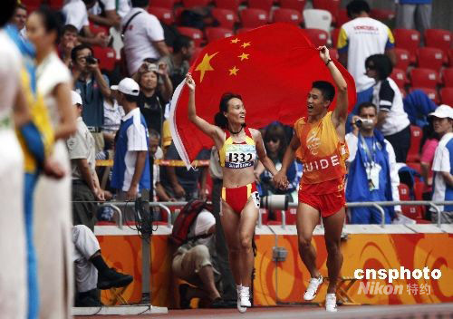 图为吴春苗与她的领跑员庆祝夺冠。中新社发 盛佳鹏 摄