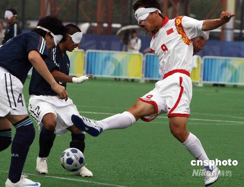 9月9日下午,北京残奥会五人制(男子)足球小组赛在北京奥林匹克公园内的曲棍球场继续举行,中国队以1比0击败实力强大的阿根廷队。残奥会五人制(男子)足球赛的参赛队由四名盲人球员与一名非盲人守门员组成,盲人球员全凭刻苦的训练与对足球的感觉在场上寻找攻破对方大门的机会。中新社发 任晨鸣 摄