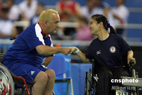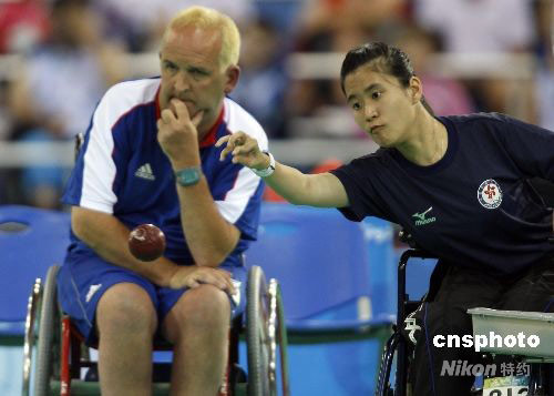 9月9日,中国香港选手郭海莹在硬地滚球混合单打-BC2决赛中,战胜英国选手奈杰尔-莫里,为中国香港队摘得残奥会首枚金牌。中新社发 杜洋 摄