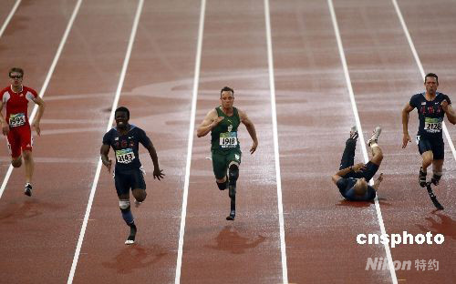 9月9日,北京残奥会男子100米-T44决赛中,被称为“刀锋战士”的南非选手皮斯特瑞斯以11秒17的成绩摘得金牌。 中新社发 杜洋 摄