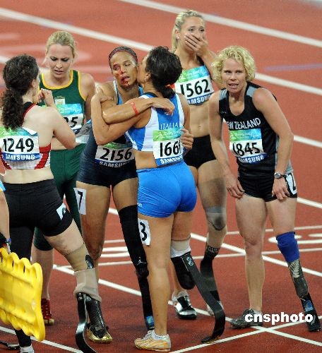 9月9日,在国家体育场进行的北京残奥会女子200米T44级决赛中,美国选手HOLMES APRIL跌倒受伤,赛后运动员们纷纷趋前问候。中新社发 CNAsports_p 摄