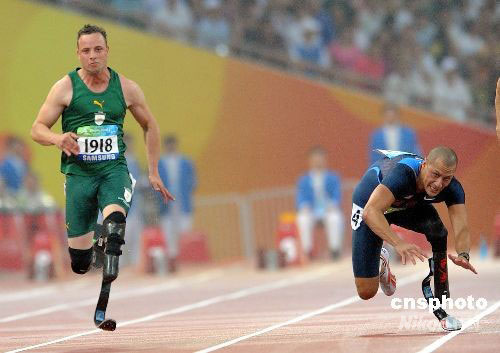 9月9日,在国家体育场进行的北京残奥会男子100米T44级决赛中,有“刀锋战士”之称的南非著名残疾人运动员皮斯托瑞斯以11秒17的成绩夺得冠军,身旁美国选手在比赛中不慎跌倒。中新社发 CNAsports 摄