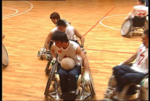 程双苗:行进中,我们可以把球抛起来,滑着轮椅去接这球,然后也可以把轮椅驱动着这样运球。