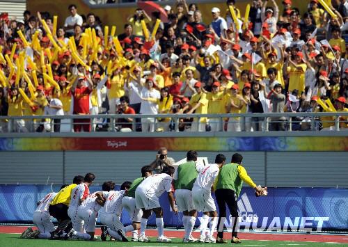 终场哨音响起,他们集体跑向北侧边线,彼此手搭肩头站成横排,然后双膝跪地,向看台上为他们加油的中国观众表达感激之情。意外的举动,令现场观众先是一愣,随即报以更热烈的掌声与呐喊。