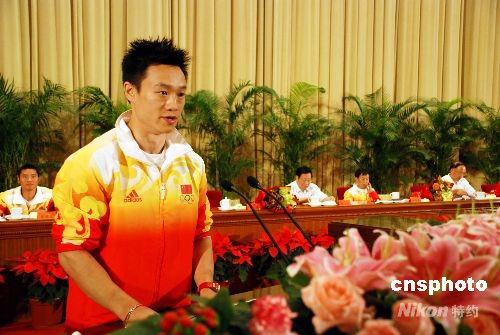 第29届奥运会男子体操团体冠军、个人全能冠军杨威在报告会上发言。中新社发 杨慧峰 摄