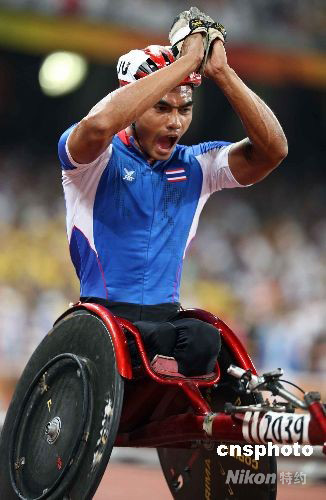 9月11日晚,北京残奥会田径比赛继续在奥林匹克公园内的国家体育场“鸟巢”举行,在男子5000米-T54级决赛中,泰国选手巴越·沃霍伦一路领先,并在最后时刻顶住各路选手的反扑,在这个一直被欧美强手统治的项目中夺得冠军。中新社发 任晨鸣 摄