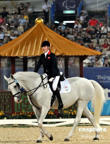 九月十一日晚,来自英国的选手索菲-克里斯琴森在香港残奥马术盛装舞步“个人自选动作科目-级别Ia”上获得金牌。图为索菲-克里斯琴森策骑马匹“朗布鲁斯科三世”在比赛中。 中新社发 邓庆乐 摄
