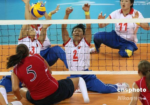 9月14日晚,北京残奥会坐式女排决赛在北京的中国农业大学体育馆举行,雅典残奥会冠军中国队以3:0战胜美国队蝉联冠军。 中新社发 任晨鸣 摄