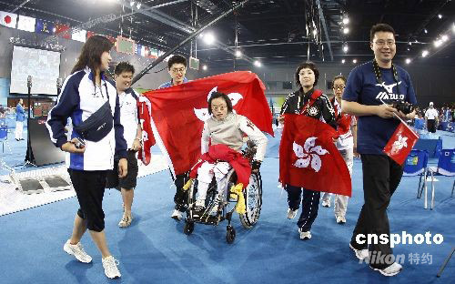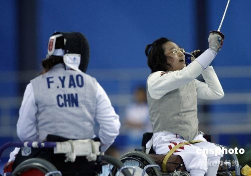 9月14日,北京残奥会轮椅击剑在北京国家会议中心击剑馆进入首个比赛日,在女子个人花剑B级决赛中,头号种子中国香港选手陈蕊莊以15-8战胜9号种子中国选手姚芳,夺得金牌。 中新社发 盛佳鹏 摄