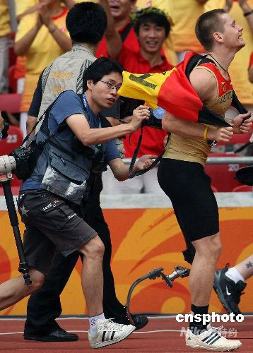 图:德国选手“鸟巢”夺冠 与记者“赛跑”
