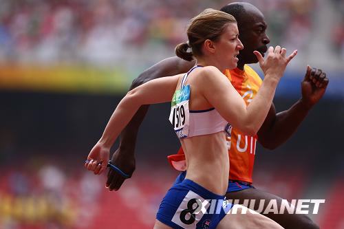 英国选手莉比·克莱格(前)在领跑员的引导下进行女子100米T12级预赛。新华社记者 张燕辉 摄