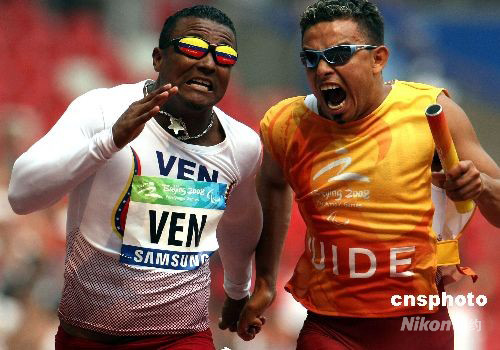 北京残奥会田径比赛9月16日继续在国家体育场“鸟巢”进行,委内瑞拉队在男子4x100米接力T11-T13级决赛中,以43秒55的成绩获得亚军。图为委内瑞拉队最后一棒选手菲尔南多·菲雷尔在助手的呐喊加油声中奋力冲向终点。中新社发 任晨鸣 摄