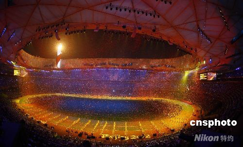 9月17日晚,北京2008年残奥会闭幕式在国家体育场“鸟巢”盛大举行。闭幕式上洒遍“鸟巢”的香山红叶和残奥圣火交相辉映。 中新社发 盛佳鹏 摄