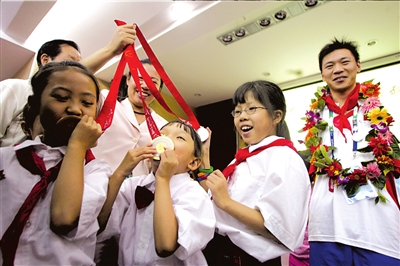 昨天,在残奥会上收获2金2银1铜的中国运动员何军权来到北京精诚实验小学,向小学生们展示他获得的“金镶玉”。作为该校的校外辅导员,何军权与他们一起分享了自己在残奥会上收获的荣誉和感动,讲述了自己的奋斗经历。失去双臂的他成为孩子们心目中的英雄。何军权说,北京残奥会是他最后一次参加国际比赛,之后他将回到湖北荆门市残联工作。