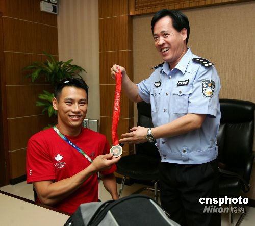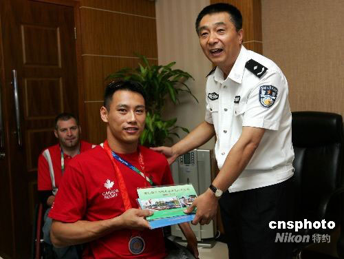 9月18日,一枚失而复得的北京残奥会奖牌由北京公交民警交还到了加拿大运动员杰瑞德手中。9月17日晚,加拿大运动员杰瑞德在乘坐出租车时不慎将自己的双肩包遗忘在车上,公交民警接警后,在线索非常有限的条件下,只用了四个小时,就将背包找回,里面有一枚宝贵的残奥会橄榄球铜牌。中新社发 富田 摄