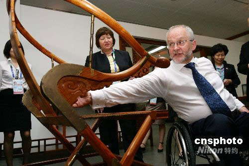 9月18日,酷爱中国传统文化的国际残奥委会主席菲利普·克雷文偕夫人到中国紫檀博物馆参观,仔细观看珍贵的黄花梨木交椅,并向全国政协委员、中国紫檀博物馆馆长陈丽华女士致谢。北京残奥会期间,中国紫檀博物馆提供紫檀家具,在克雷文夫妇下榻的港澳中心专门布置了充满浓郁中国传统文化特色的会客厅、办公室。中新社发 毛建军 摄