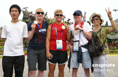2008年9月18日,几位获得北京残奥会金牌的美国盲人运动员来到北京天安门广场游览,吸引了众多游客的目光,游人们竟相与他们合影留念。中新社发 玉龙 摄