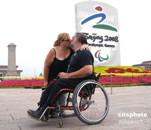 2008年9月18日下午,一位外籍北京残奥运动员在妻子的陪同下来到天安门广场游览,两人在高兴之余忘情拥吻,表达一片浓浓的爱意。 中新社发 玉龙 摄