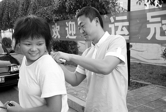 签名、合影,几乎成了马琳昨天重复最多的两个动作。马琳则一概表现出巨大的耐心,全力配合。一位胖胖的小女孩一直跟随了马琳走出几十米后还没签上名。“我不敢!”小女孩说。看着马琳走到训练馆门前,即将上车,小女孩终于鼓起勇气冲上前去要求马琳签名。“给我签在背上好吗?”小女孩要求。马琳于是转到女孩身后,在女孩的衣服上郑重签下了自己的名字。