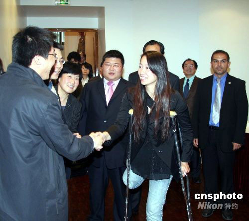 十九日晚,曾与中国奥运火炬手金晶结下“战斗友谊”的旅法华侨华人和中国留学生在巴黎举行欢迎会,以掌声和亲情迎接金晶重返巴黎,访问法国。图为金晶与部分一同参与北京奥运火炬巴黎传递的华人与留学生火炬手、护卫手等“老战友”喜重逢。中新社发 吴卫中 摄