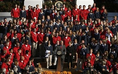 美国总统布什7日在白宫南草坪会见美国奥运和残奥代表团。