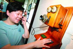 在水木自亲殿内立桌上摆着一部仿古桌机,桌机的两侧镶嵌了黄色的龙形雕刻。体验者拿起听筒就能听到电话铃声,这时电话已经和故宫内的故宫皇家电话局连通,对方的工作人员会接通电话和体验者进行交流。如果赶得巧,颐和园内的游客体验者能够和故宫内的游客体验者进行交流。仿古桌机的对面是一部仿古木制墙机,这部电话机是一部IC卡电话机,游客可以使用IC卡给家人朋友打电话报平安。(侯艳)