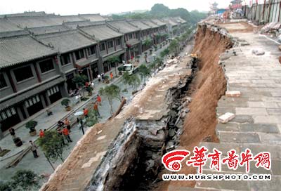 记者今天在现场看到,原本平整的城墙内侧墙面变得坑坑洼洼,面目全非,在大约近百米长的城墙上,有一道长约十八米的大裂缝,还出现了四五个不规则的大洞,大的长达五六米,小的也有二三米,洞的周围明显显示出不规则的坍塌痕迹。有关部门在靠近城墙处拉上了黄色警戒线,有专人在两边疏导交通,指挥车辆通过危险路段。