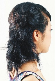 抓出半头发量,向右侧斜抓,抓发量时依照个人发量不同,要兼具绑出来的份量,以及留在底下的份量,以斜边扭转,借着扭转与侧边线条,较能看出发量是否均衡。旋转发夹夹入位置,就是一般发簪的位置,只是以旋转的方式更能扭紧结构。