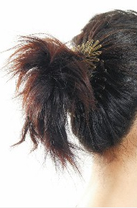现在,拿出蜈蚣发圈,把它当成绑头发拿用,以蜈蚣发圈绕两次绑头发,第一圈是外圈,用来固定外围发跟,第二圈则接近马尾发束,固定后,再将马尾以垂直的方向,上、下撕开,藉由高低层次,感觉马尾变长了,是属于聪明的马尾,中长发的你,一定要学喔!